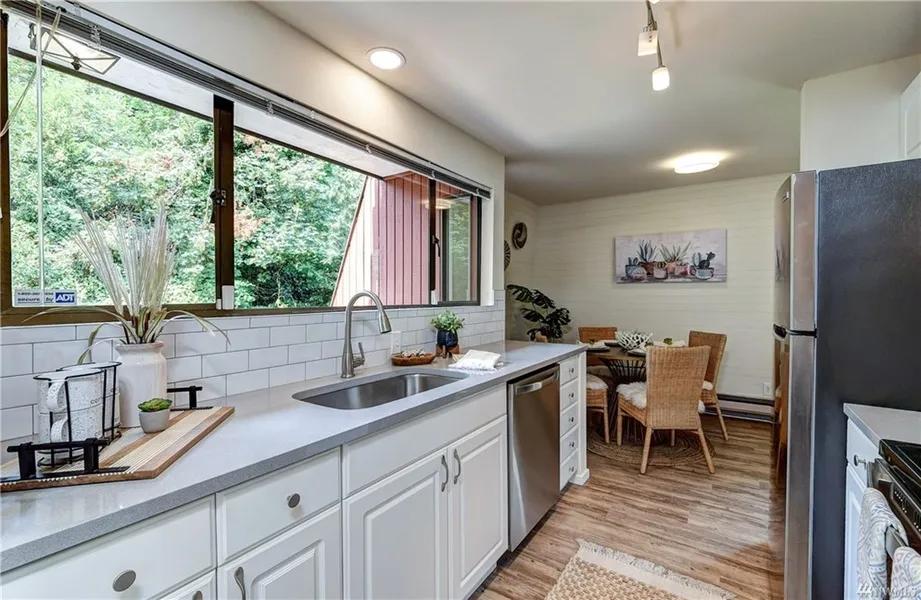 Renovated Midcentury Style Condo, private, spacious and welcoming. Quiet, 2 story corner unit Townhome style condo features 2 large bedrooms, 1.25 baths. Open Concept living, electric fireplace, vaulted ceilings, ceiling fan, electric Fireplace, 3 balconies and floor to ceiling double paned windows with views of the pool and raised garden beds! Kitchen has all NEW SS appliances, new quartz counters and modern subway tile backsplash. New laminate flooring downstairs, newer painted interiors, updated lighting, new W/D in unit~plus newer Water Heater. Lots of parking & storage. Community garden, relaxing pool. NO RENTAL CAP, no pet restrictions and low hoa dues. Ideally located by I-5 & 1 minute from new Northgate Link, opening soon!