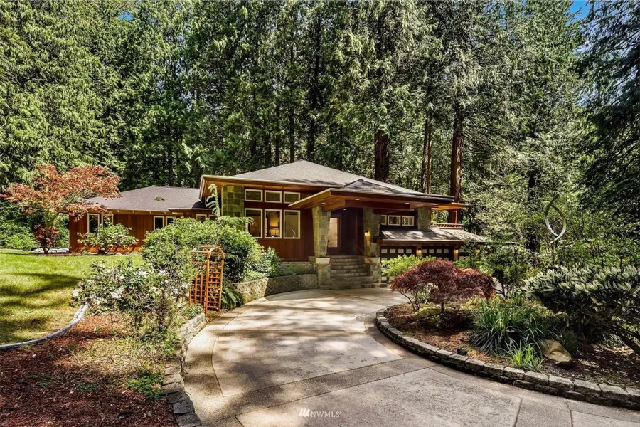 Beautiful custom home with Frank Lloyd Wright inspired design! A circular driveway welcomes you to this dramatic property with almost 4000 square feet of living space. The cantilevered slate entry opens to a two story atrium and a ridge skylight. Soaring ceilings, large spaces and wood wrapped windows. The home sits on over 2.74 acres of privacy - complete with walking trails and a seasonal creek, coveted old growth trees and mature landscaping. Entertainment size decks - Tons of storage - Extra finished rooms. Live large in this one of a kind home!