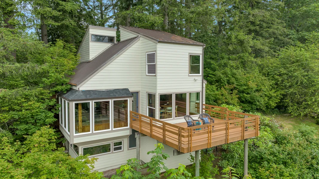 Exquisite light filled home that was the architects private residence. Sited with views of the Olympics and rollin hills plus amazing sunsets. Soaring ceilings, lots of new windows and natural wood finishes make it feel like a fancy treehouse. Lofted primary bedroom can open secret panels to the main level. Large view deck off the main level for entertaining or just relaxing. Lower level has 2 large bedrooms, both with either secret storage or large walk-in. Outside is honestly heaven with trails all over, woods, fenced in areas, pastures, open area with a play structure and a 4 stall barn. Outside lower patio is huge and has hosted years of celebrations, now it is your turn.