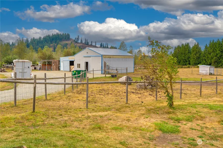Rare find with SHOP! Love It... lives large a two-level farmhouse, Mt Rainier views & set up for horses! This sunny, sprawling setting just north of central Enumclaw has everything you could need for your four-footed friends: barn, fenced & cross fenced pastures, corrals, loafing stalls, paddocks, tack room, hay storage, hitching post, & nearby riding trails! The 2-level home features hardwood floors, laundry both levels, updated electrical panel, generator wiring. There's more! Huge insulated shop, stove & 200 amp service & its own meter. Inside your new home, you'll find 4 bedrooms, 3 baths, expansive living, new updated lower level! Updated kitchen, granite, exposed wood beams, walk-in farm pantry. Your farmhouse near riding trails!!