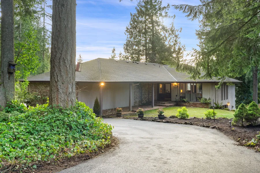 Light-Filled Mid-Century Home on Redmond’s Union Hill!! 3.69 Total Acres. 2 Separate Tax Parcels (1 acre with home, 2.69 acres of open pasture). This gem's level-in main floor features vaulted ceilings and skylights, a generous primary bedroom with ensuite, 2 bedrooms and additional full bath. Light bright kitchen with French doors and den leading onto large deck overlooking gardens. Lower level features include tiled large rec room and full apartment suite with private entrance and outdoor space overlooking gardens. Outside, enjoy the large outbuilding workshop with art loft and tool room. Nature Galore! Greenhouse, Orchard, Pasture, Livestock stalls and corral. This property has limitless possibilities. Nature's Sanctuary just minutes from Redmond!