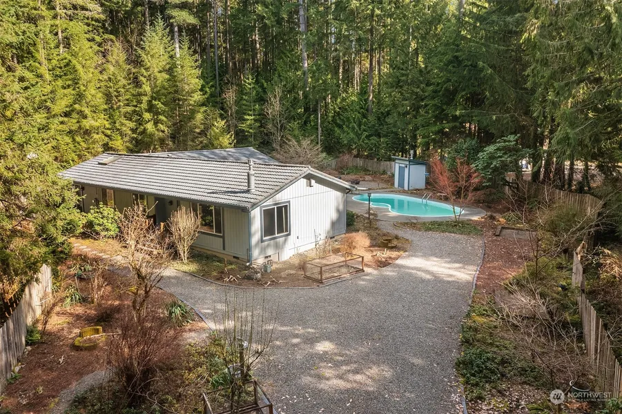 This spacious & cozy 3 bedroom, 1.75 bath is the perfect place to call home. With 1540 sq. feet of living space this home includes a stylish kitchen with quartz counter tops, a tile back splash and breakfast bar. There are skylights that flood the home with natural light while the wood paneled living room is warmed by a natural gas stove. The primary bedroom is an oasis with it's own ensuite bath, and sitting porch. Down a private drive, the fully fenced home sits on a secluded 2.55 acre lot. Outside, there's an inground pool and hot tub, large deck, horseshoe pit, garden space, room for a fire pit and more. Plus, plenty of paved parking for your RV, boat or guests. Close to Woodinville shopping, dining, and highly rated Northshore schools.