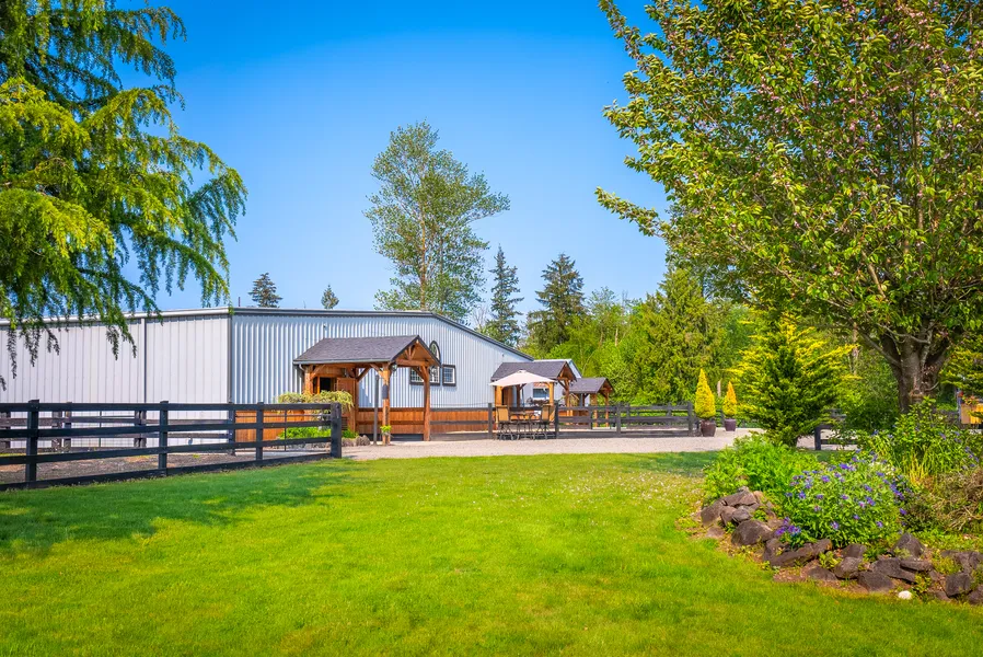Internationally known horse boarding and training facility on shy 20 acres! One of a kind gated, fenced and cross fenced property with multiple pastures and Mount Rainier views. Impressive 108X125 Indoor Arena Building with 15 stalls and office/viewing room, tack room, wash rack, ready room and 1/2 bath with laundry. Boarder Barn is 36X120 with 36X40 Covered turn-out, 16 stalls, 2 feed rooms, ready room and storage room. Additional 12X30 barn with 2 stalls. Shop is 24X72. Great land has been thoughtfully fenced with 11 pastures. 2 homes (1 stick built and 1 Manufactured). Cute craftsman house has been updated and has views of its own.