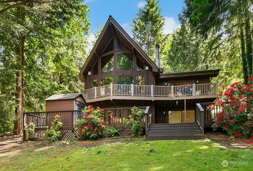 Trade a traditional layout for a large and private lakefront property. Sit on your deck and take in the open space surrounded by trees and backdropped by the lake. Towering ceilings and expansive windows fuse contemporary comfort with serene lakeside living. Equipped with a dock, a deck primed for a hot tub, and a whole-house generator connection. Outdoor aficionados will appreciate over an acre of wooded bliss. Recent upgrades: plush carpeting, fresh paint, and lighting, enhance its allure. Generous storage, a cozy wood stove, and idyllic lake views fashion a haven of tranquility. Sun-drenched interiors bathe in natural light, offering a serene respite amid nature's splendor.