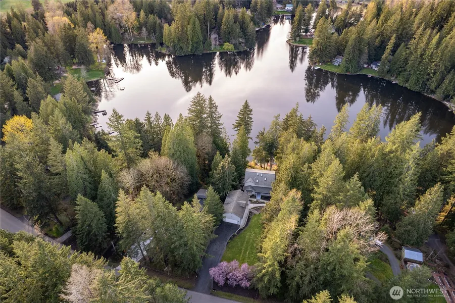 A truly special Lake Marcel waterfront home. This beautifully updated custom home is sited above 70' of low-bank west facing lakefront with dock, fire pit, and picnic area. Enjoy sunset water views from nearly every room! The chef's kitchen boasts slab quartz counters and backsplash, SS appliances with gas range, and a large island workspace. Recharge in the tranquil primary suite with 5-piece bath and walk-in closet. Soaring 10' ceilings and ample space for the ultimate media room make the lower level of this home an entertainer's dream. 4 bedrooms upstairs, 2 offices, main floor powder + 3 additional bathrooms, mud room, 4 car garage / shop, 960 SF unfinished loft, and built-in generator. Pre-wired for hot tub and power driveway gate.