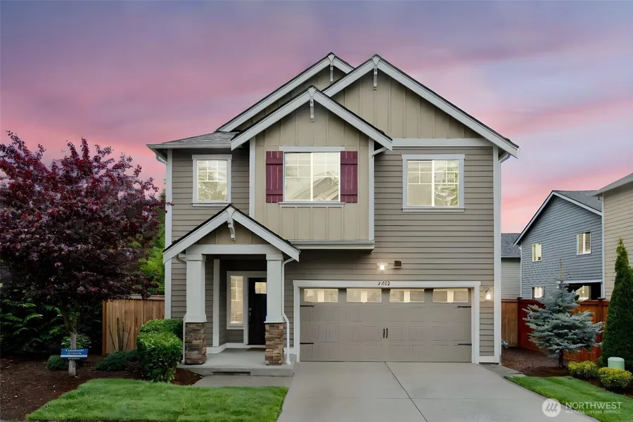 Stunning Lennar resale built in 2019, situated on a quiet street in sought-after Bothell! This east-facing home offers an open floor plan featuring a spacious kitchen with quartz counters, premium laminate hardwood floors, and modern luxury finishes. Main floor den with adjacent shower offers flexibility as a guest suite. Upstairs includes an inviting loft, a generous primary suite with walk-in closet, and three additional bedrooms. Enjoy outdoor entertaining in the fully fenced backyard with patio. Ideal location near BASIS Independent Bothell, Miner's Corner County Park, and quick access to I-405 & 522. Award-winning Northshore SD. Pre-inspected and Wi-Fi Certified Smart Home!