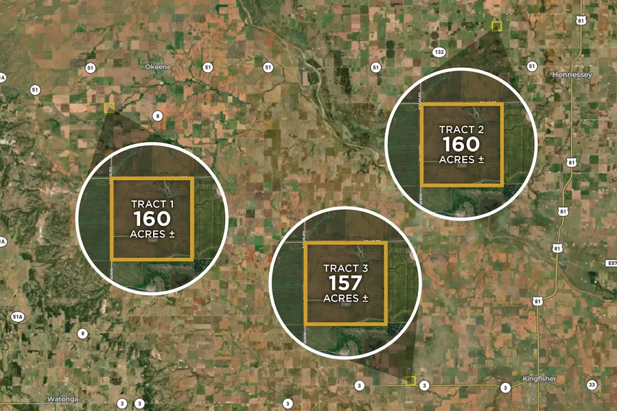 Just west of Kingfisher, 7 miles on the north side of State Highway 3, this tract has a little of everything. Approximately 113.03 +/- acres is currently being farmed and raising a wheat crop. The remainder of the acreage is a variety of shelter-belt tree rows and grass pasture. The tillable soils contain primarily loamy fine sand that are all class 2 & 3 soils with 0-3% slopes.