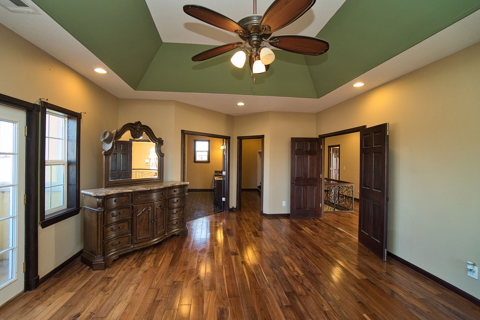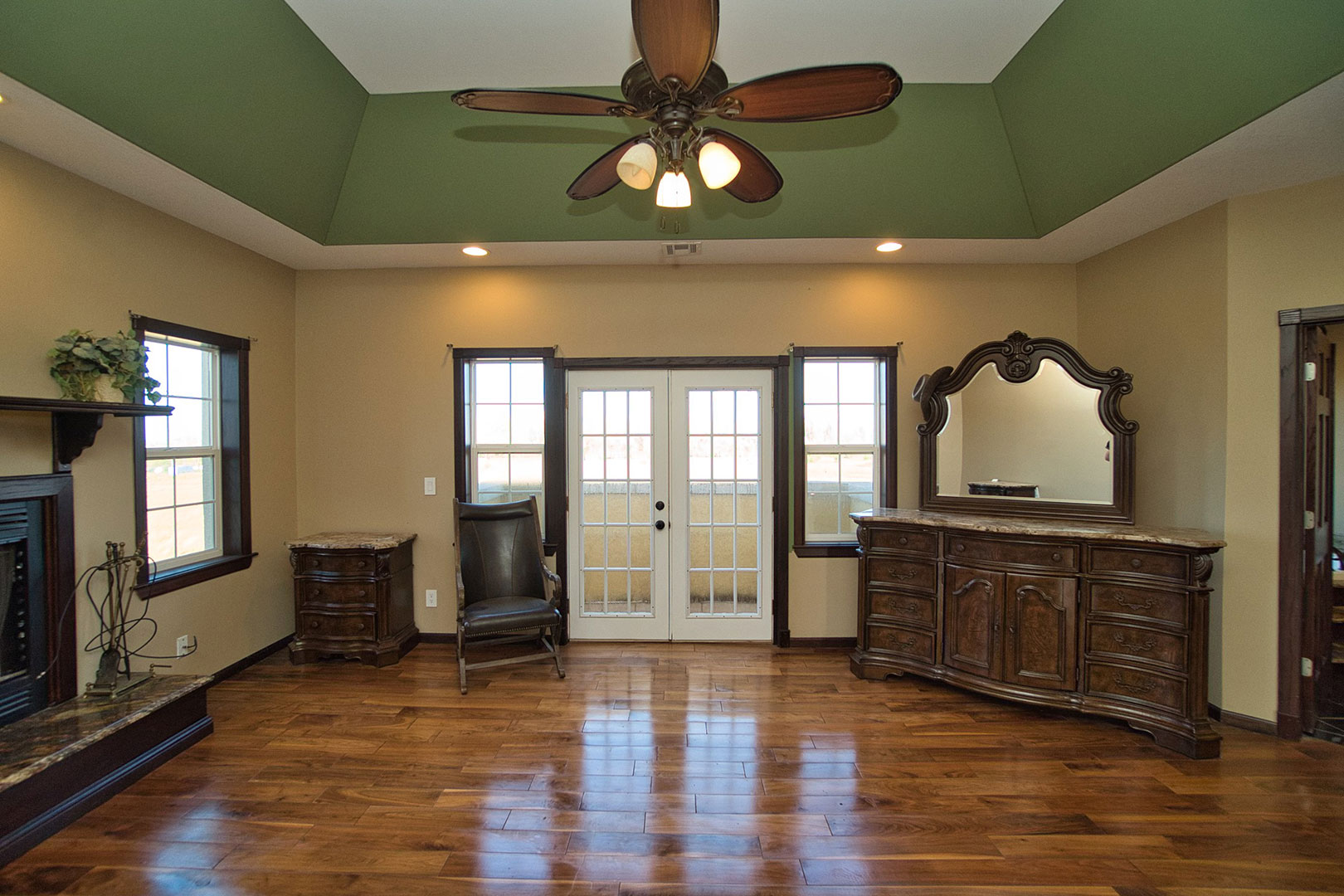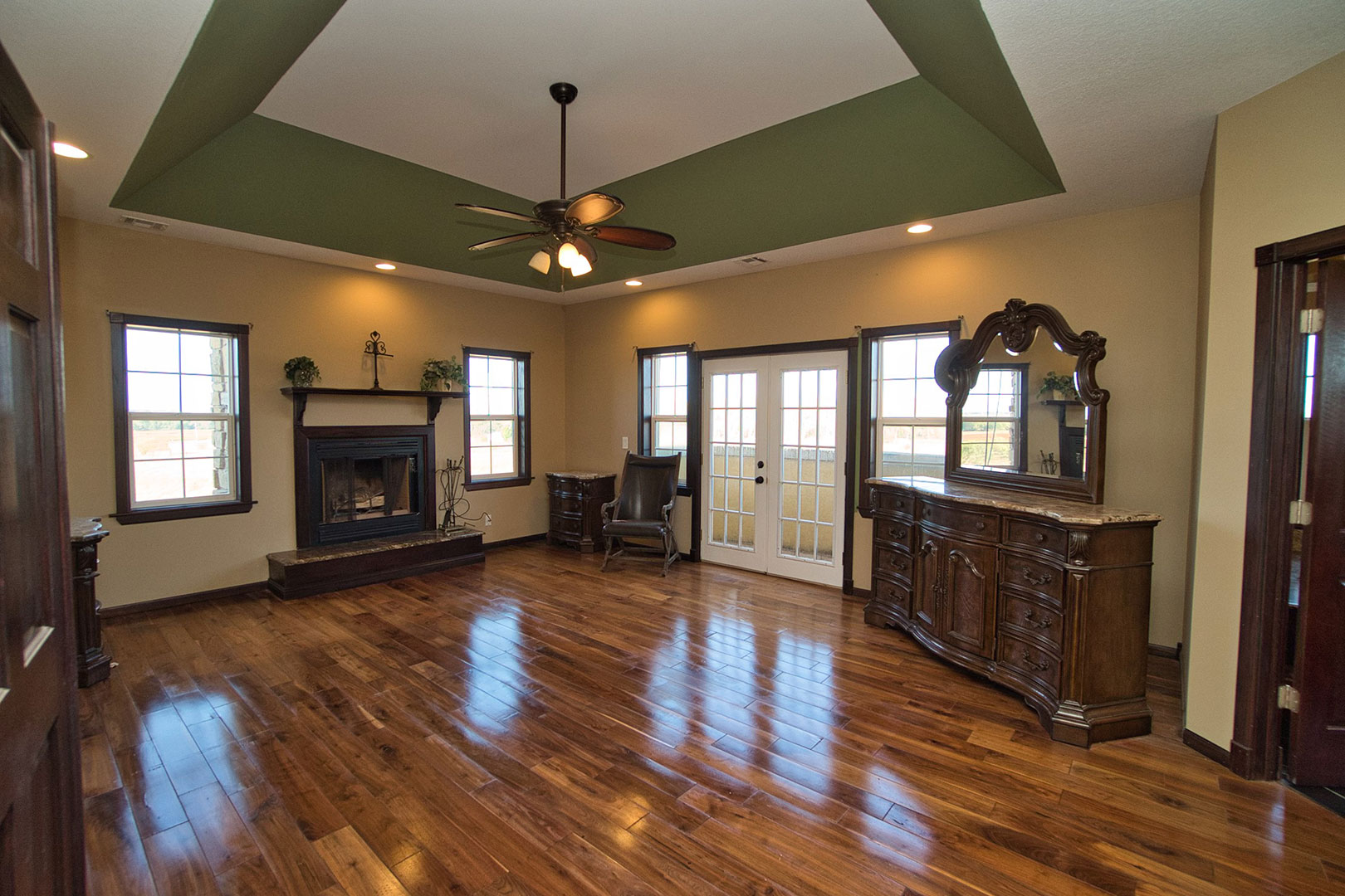Primary bedroom with tray ceiling, wood-burning fireplace, French doors to balcony, and ensuite with jetted tub, walk-in shower, and double sinks. Walk-in closet
