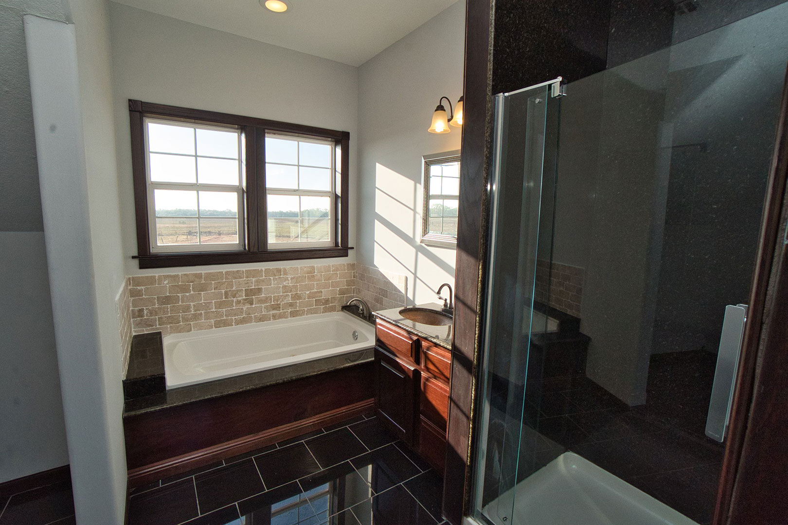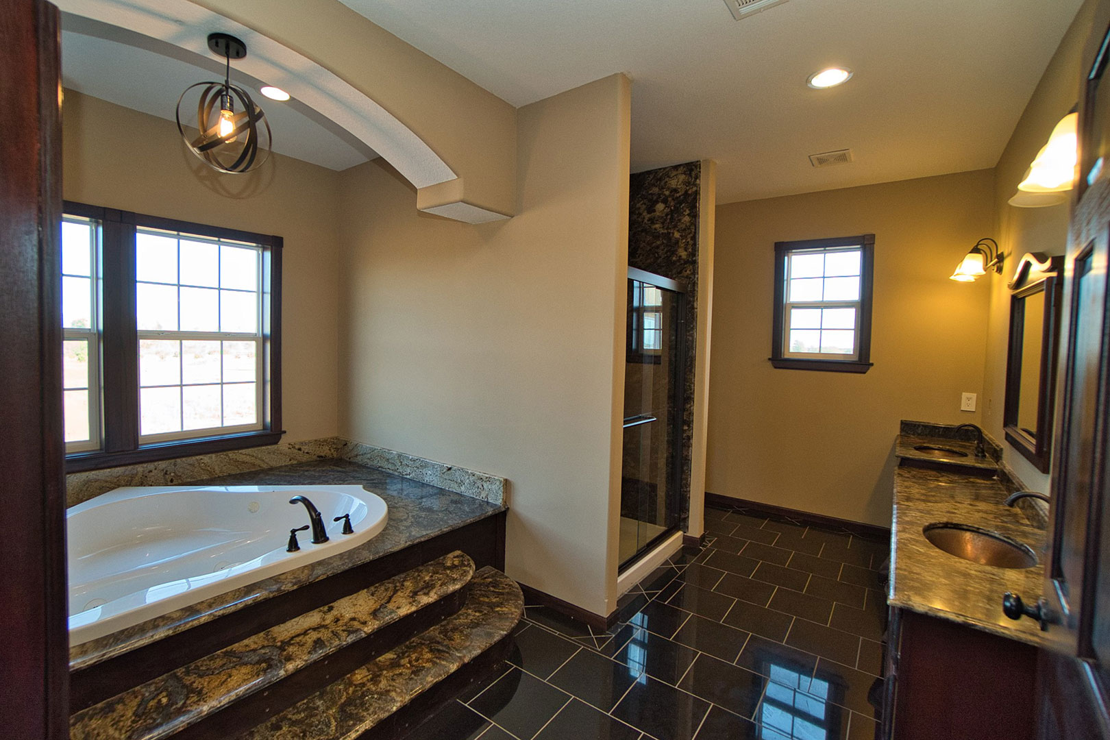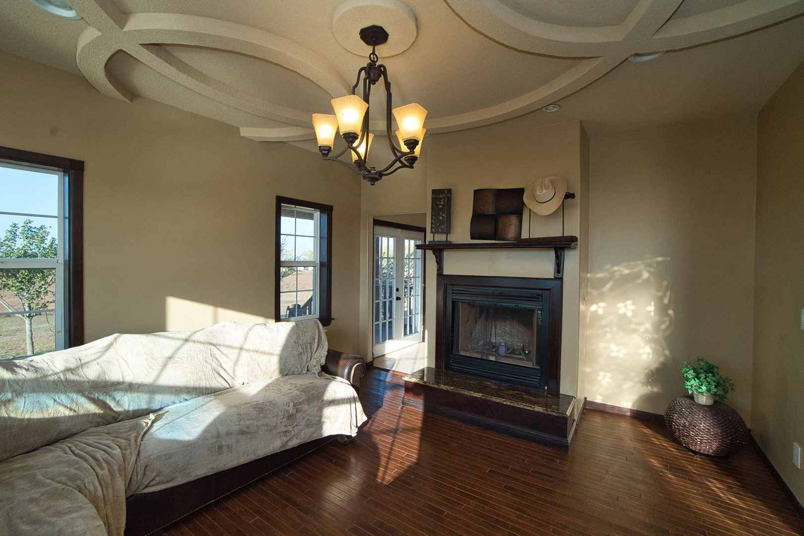 Primary bedroom with tray ceiling, wood-burning fireplace, French doors to balcony, and ensuite with jetted tub, walk-in shower, and double sinks. Walk-in closet