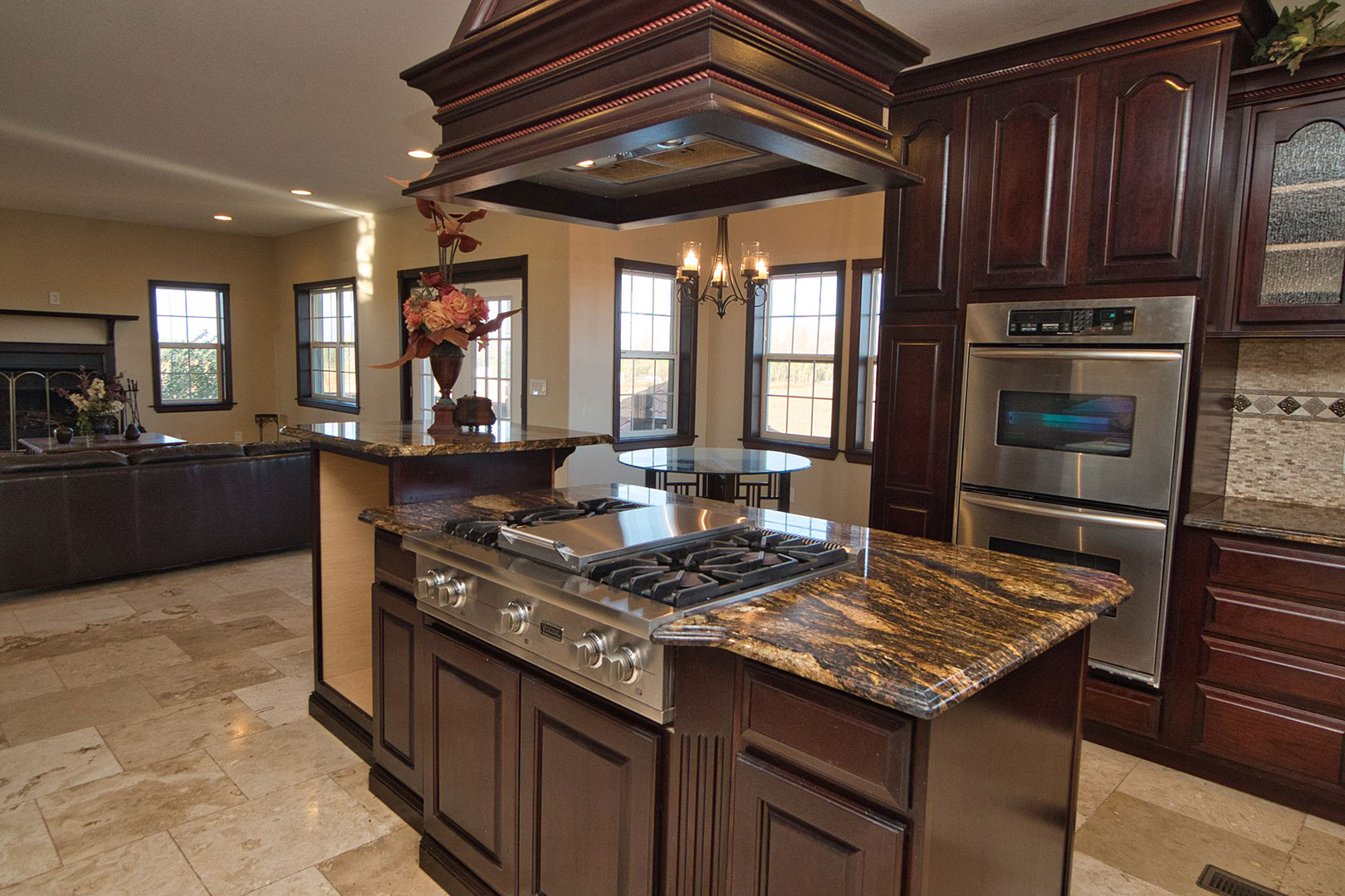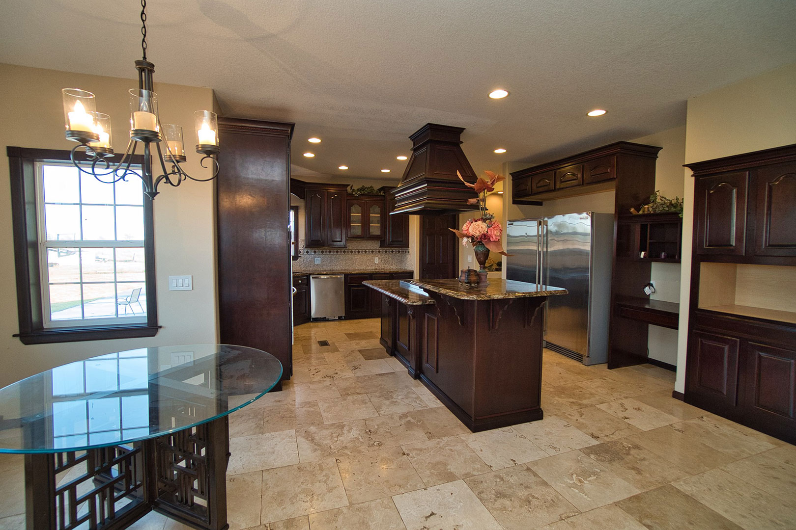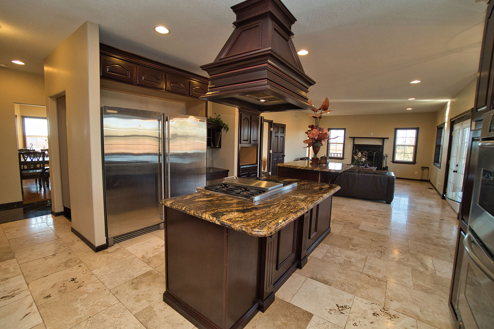 Kitchen with granite countertops, pantry, island, desk, and pantry