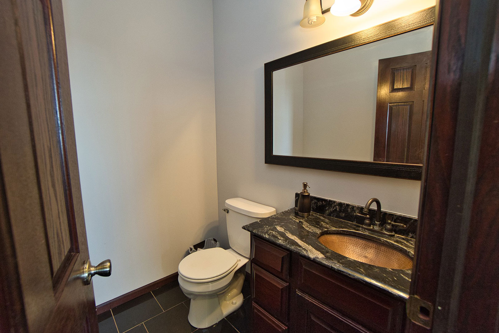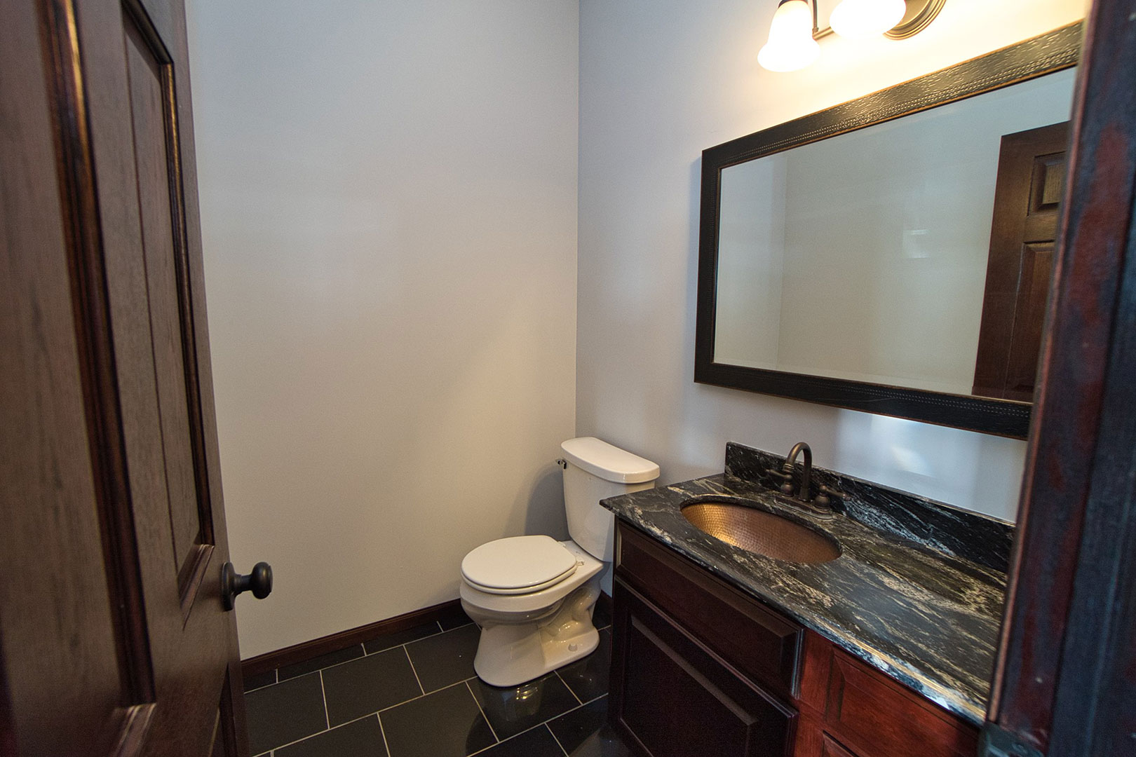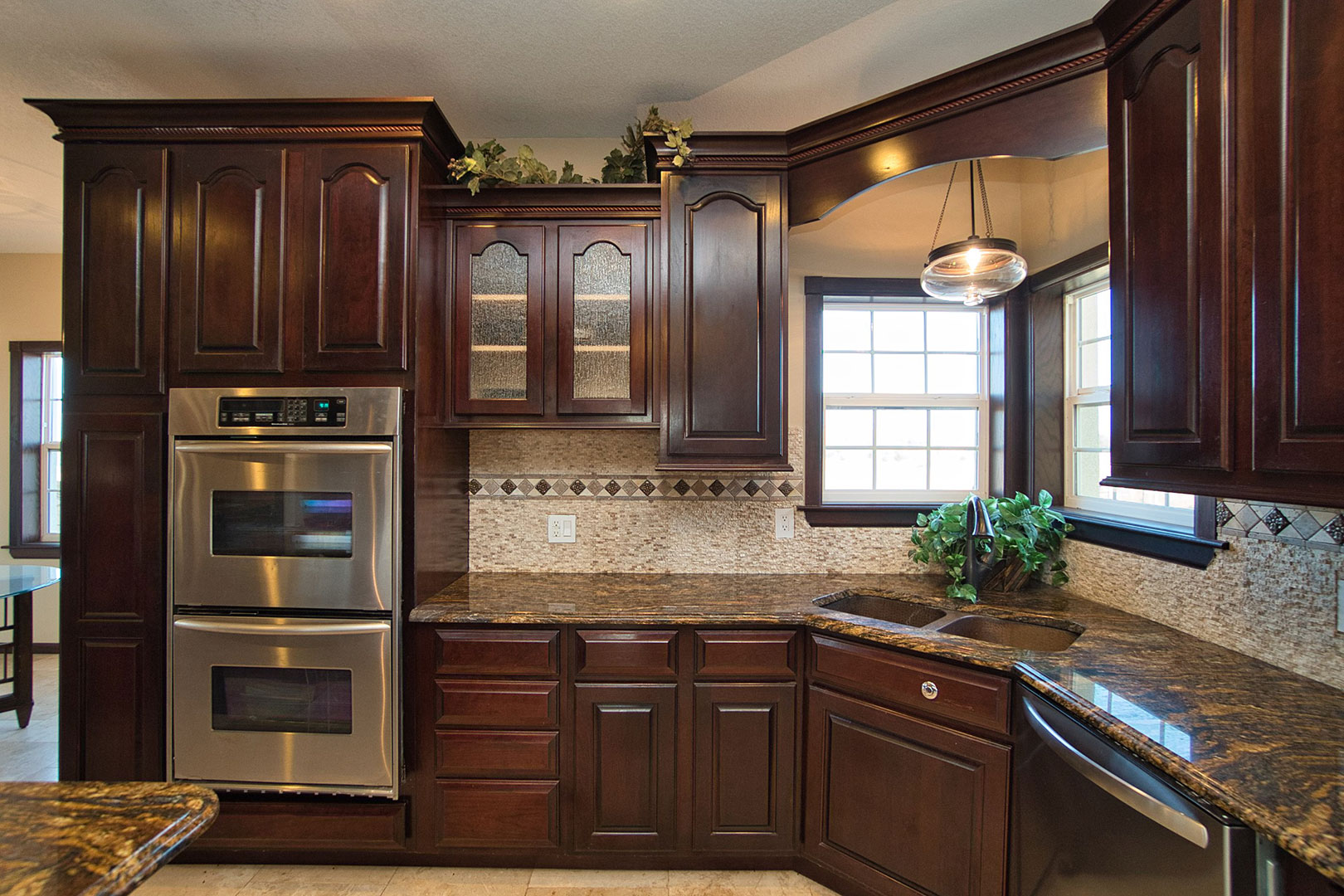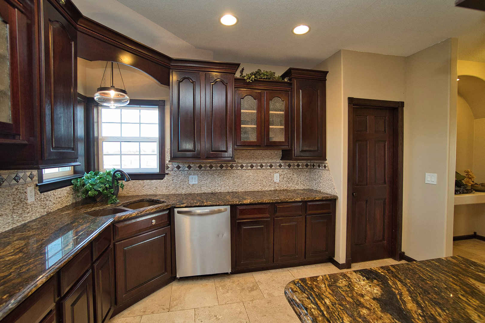 Kitchen with granite countertops, pantry, island, desk, and pantry