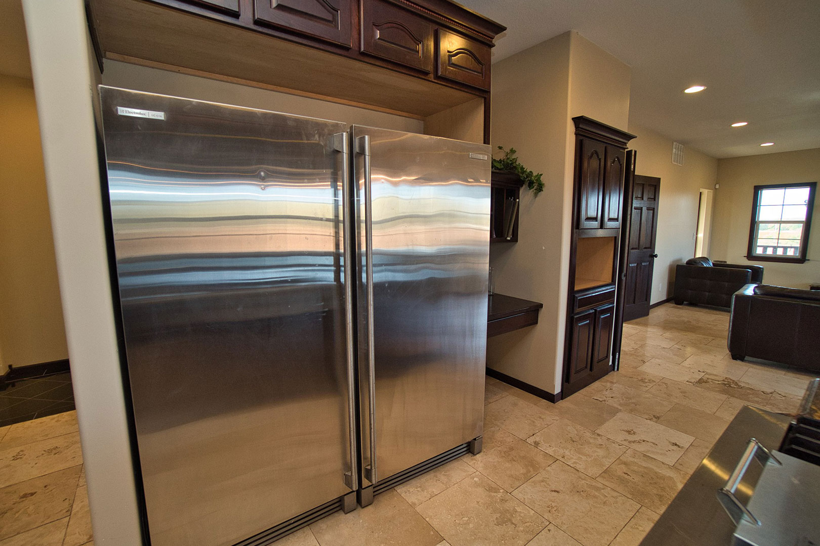 Appliances: Industrial size double door stainless steel refrigerator, dishwasher, cooktop, and double wall ovens