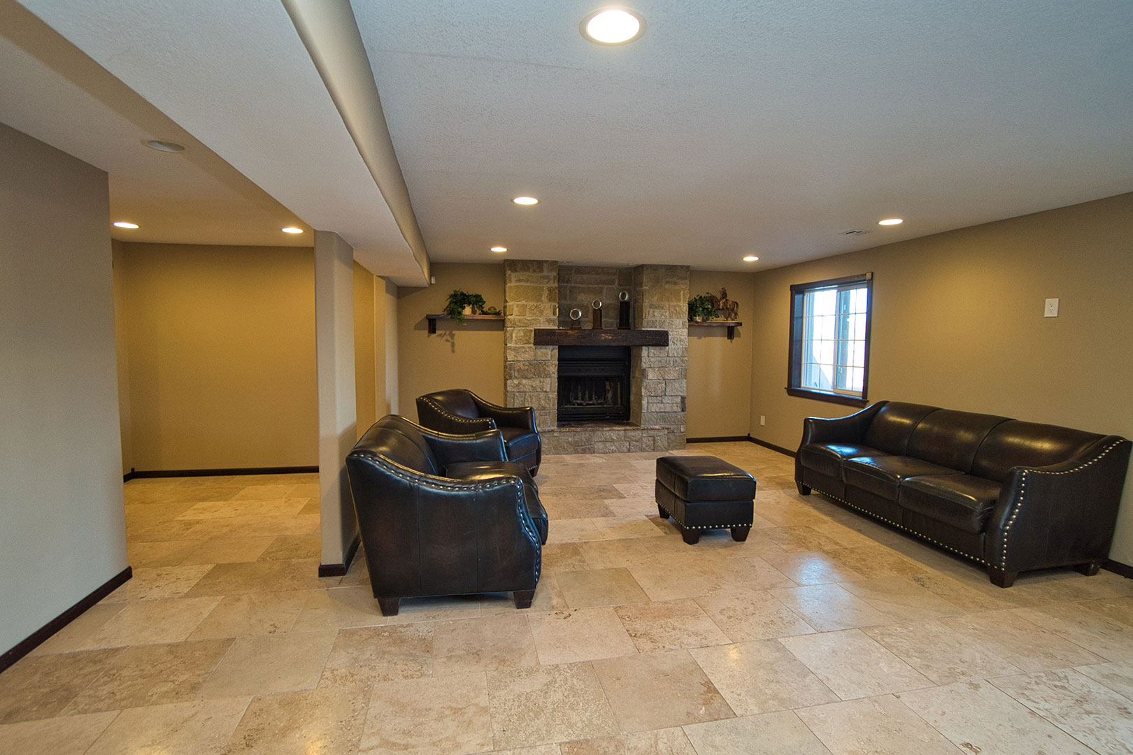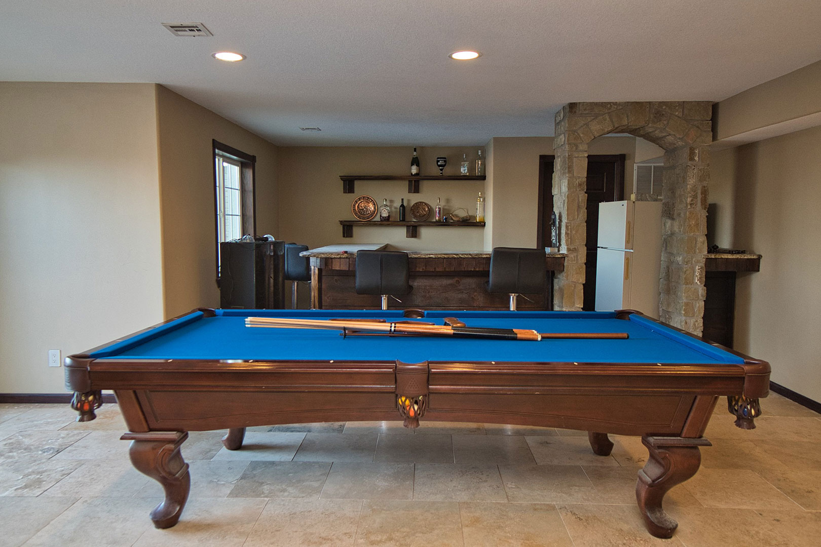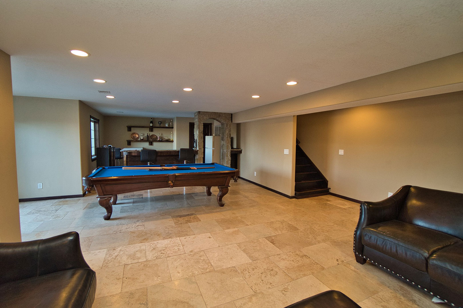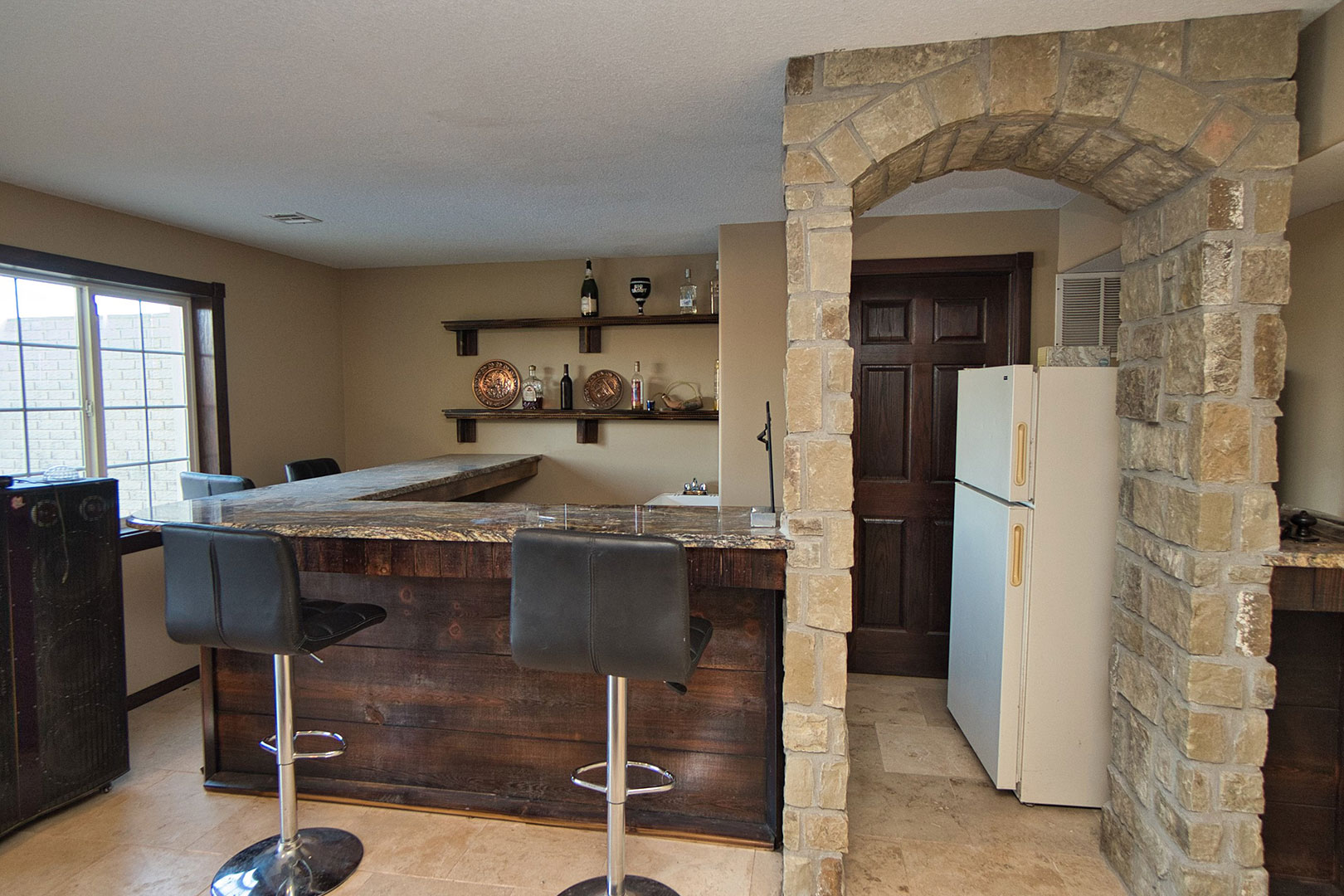 Large family/rec room with recessed lighting, outside access, a wood-burning fireplace, and dry bar