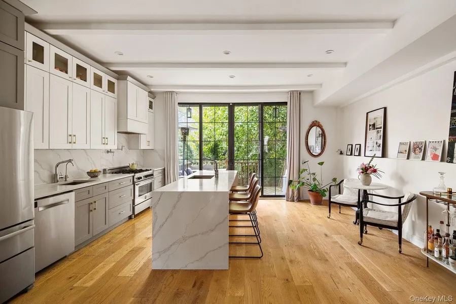 Welcome to 1324 Jefferson Ave, an exquisitely renovated two-family sanctuary in the heart of Bushwick. Tastefully and thoroughly transformed just five years ago, this 2,565 square-foot home has been lovingly lived in and cherished, offering modern bliss chock-full of warmth and character. Configured as a loft-like 3 bedroom, 2.5 bath owner's duplex and an income-generating 3 bedroom, 1.5 bath garden apartment, this home delivers the best of both worlds. The top to bottom renovation included a renewal of all mechanicals, HVAC system, roof, and appliances - and A/C condenser replaced a few months ago - this home offers masterful living assured by recent updates of all systems and finishes. Upon entering, you step into a 45 foot long open living space bookended by a full wall of windows in the back and bay windows in the front - evoking an unusual loft sensation within a townhome. You choose the cherry on top, between the cozy gas fireplace, high ceilings, wide-plank white oak floors, the multiple finished outdoor areas, or the floating oak and steel stairway. Cooks and entertainers are delighted by the kitchen, flaunting its Bertazzoni range and Bosch appliances, abundant storage, and an oversized quartz island with a second built-in sink. The dreamy kitchen features floor-to-ceiling windows overlooking the deck and lush garden. When fully opened, the deck becomes an extension of the home, making it the perfect spring and summer showpiece. The garden is distinctive - delicately designed with slate pavers, raised garden beds, separated areas, and custom irrigation and lighting. Upstairs, three bedrooms surround the landing, a centerpiece of itself with 11-foot ceilings, stunning skylights, and a wall of whitewashed exposed brick expanding up from downstairs. The full-width primary suite offers a private terrace, home office nook, and a luxurious bathroom with radiant heated floors. Two additional sizable bedrooms, a sleek bathroom featuring a walk in shower and bathtub, and a dedicated laundry room complete the level. The garden level 3-bedroom, 1.5-bath rental unit matches the upstairs quality with washer/dryer, central A/C, private patio, and excellently finished spacious basement - perfect for a studio space, fitness or media area. The unit checks all a renter's boxes, guaranteeing top rental income for the area, or perfect extended family living. Located near the Halsey & Wilson L and Halsey & Gates J/M/Z trains, your peaceful retreat is within quick access to central Bushwick's vibrant scene. The immediate surroundings are developing quickly and have a strong sense of community - you can start your mornings at L'Imprimerie Bakery with Parisian pastries, enjoy comfort food and cocktails at Father Knows Best, or experience the bold flavors of Money Cat. Steps from Irving Square Park and the iconic Bushwick Collective street art, you're surrounded by world-class culture, artisan coffee shops, and weekend markets. This home curates a tasteful, inspiring and peaceful lifestyle in one of the world's most exciting neighborhoods.