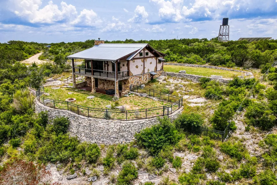 A two-story retreat style home with a large solar panel and water tower with a 360-degree observation deck is awesome. The property access is through a well-maintained gravel ranch road through 2500 acres. Located 30 minutes north of Brackettville and 1.5 hrs. from Uvalde, TX, the property consists of hills overlooking a valley that has a combination of cedar and oak trees. This property hasnt been hunted in several years and shows to have wildlife throughout the place ideal for hunting and observing nature. There are several cement watering stations already present for birds and wildlife. It's high fenced on two sides and low fenced on another allowing for wildlife to travel onto the property from surrounding countryside. A true off-grid hill country retreat complete with a hilltop home surrounded by big country and starry skies.