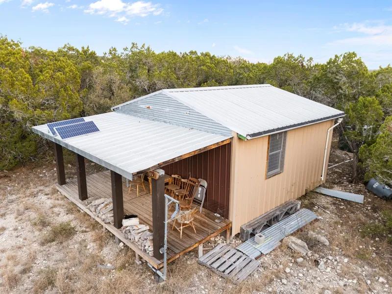 Come out to beautiful Leona Ranch to see this fine hunting retreat (or could be just a nice getaway). This is a corner lot with a cabin. It has a large main room and a bedroom with bunk beds, and there is a three-year-old metal roof. A nice covered porch was added two years ago. Power is supplied by solar panels, and a rain catchment system provides water. A 1500-gallon cistern is situated behind the house for water storage, and pvc piping directs water to a stock tank with a float switch where a feed pen and blind are located. There are solar lights and receptacles. Three bow blinds, one feed pen, and three feeders convey. There are several trails through the property, which is secluded and private, with beautiful views and clearings. There is lots of game, including white tail, hogs (galore!), and the occasional exotics to include axis deer. A skinning hoist is on the property as...