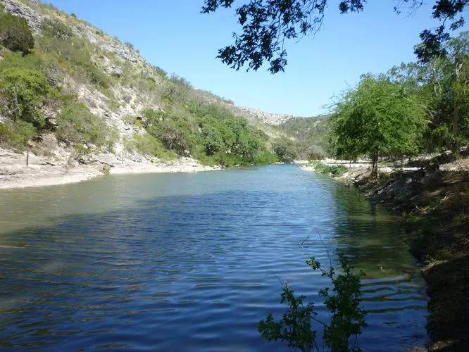 DESCRIPTION: Fabulous hunting ranch in the beautiful Nueces Canyon with permanent flowing creek and several springs that kept flowing in the recent drought. There are two small lakes dammed up on the creek that are suitable for fishing and swimming. Mostly high fenced with exotic and trophy whitetail deer, turkey and hogs. Land is a good mixture of hills and valleys with scenic bluffs. There is excellent cover for wildlife and the ranch is very private and secluded. Access is from a deeded easement through a large ranch. Fantastic views over 1,900 feet and very pristine.