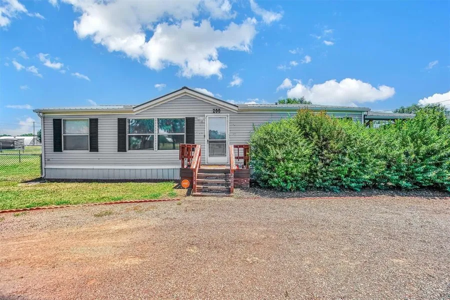 Just minutes from Tom Steed Reservoir, this 3 bedroom, 2 bathroom mobile home sits on a whole city block, that is fenced in. The home has a circle drive and a drive way with a carport in the front. The front door opens into the living area, with batton boards and a wood burning fireplace with mantel, and vinyl flooring. The kitchen has a window that overlooks into the living area by the sink. The kitchen also includes electric range/oven, matching dishwasher, a kitchen island, plenty of cabinet space and a breakfast nook with a sliding glass backdoor that opens onto the covered deck. All bedrooms are carpet, the primary includes walk-in closet, and en-suite bathroom. Home is total electric, metal roof, all flooring is new in kitchen and living room. Did I mention that this property sits on a whole city block? Outside you'll find a motorhome storage that is 12ft tall and 10ft wide, a storm shelter for those spring storms, 3 storage units; one is 20x40, 20x25, and 10x12! Imagine all the possibilities you can come up with in owning this property.