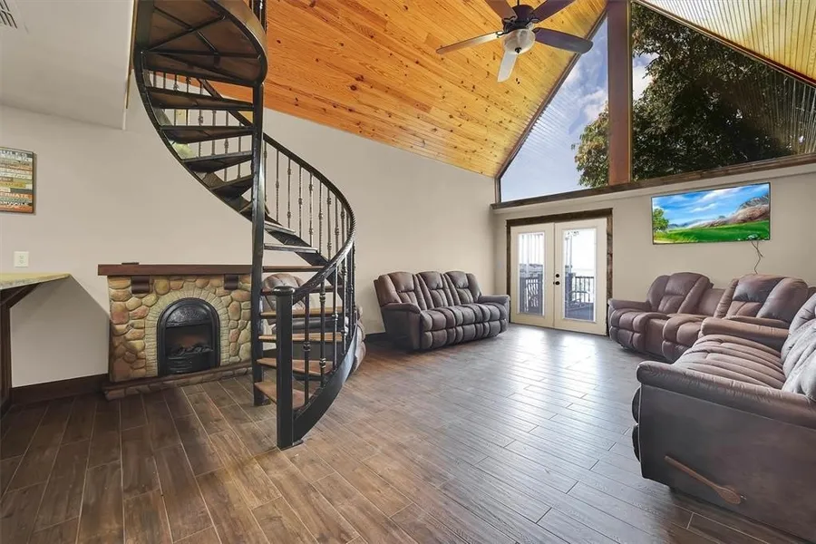 A custom-built lake house retreat that’s hidden in plain sight! This is a 2 bedroom PLUS loft that comes with 2 baths and a custom upgraded kitchen with granite counters, and SS appliances that includes a refrigerator, electric stove/oven, microwave, breakfast bar and overlooks the living area. The spiral staircase takes you to the private loft area that also overlooks the living area. Master bedroom/bathroom has shower/tub combo. Beautiful tile flooring in most of the home and ceramic tile in the bathrooms. Metal roof, gutters & downspouts on the main house. Also included is an adorable older home that comes with three bedrooms, one bath and a screened in porch and may need a little love……The red garage is also included. All three properties will be sold together.