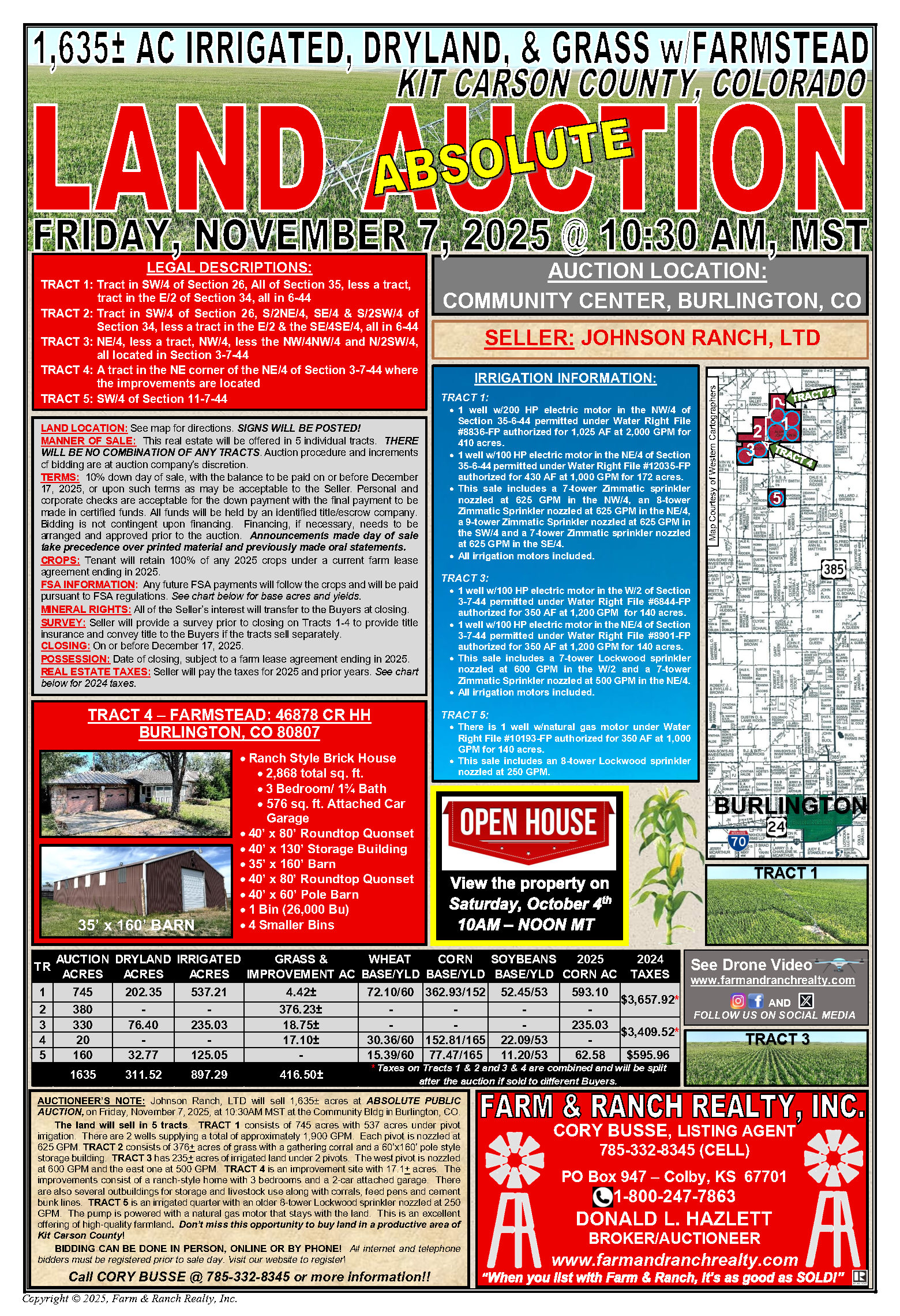 Johnson Ranch, LTD will sell 1,635± acres at ABSOLUTE PUBLIC AUCTION, on Friday, November 7, 2025, at 10:30AM MST at the Community Building in Burlington, CO.