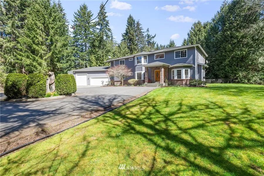 Large, private living on 2.5 acres in Poulsbo! Drive up to the circular driveway, and enter this charming 4bed/4bath, 4284 SF home. Grand entry with winding oak staircase, formal living & dining rooms, huge rec room, private office, large family room with wood stove, master suite with fabulous jetted tub, open kitchen w/ walk in pantry, bonus art/music room, & 2nd master. Many recent updates include new carpeting throughout, refinished hardwood floors, fresh paint, and newer SS kitchen appliances, including wine cooler! Enjoy views of the peaceful surroundings from several bay windows throughout the home. French doors open up to patio and huge, fully-fenced backyard. 1,049 SF 3-car garage includes RV stall and loft storage!