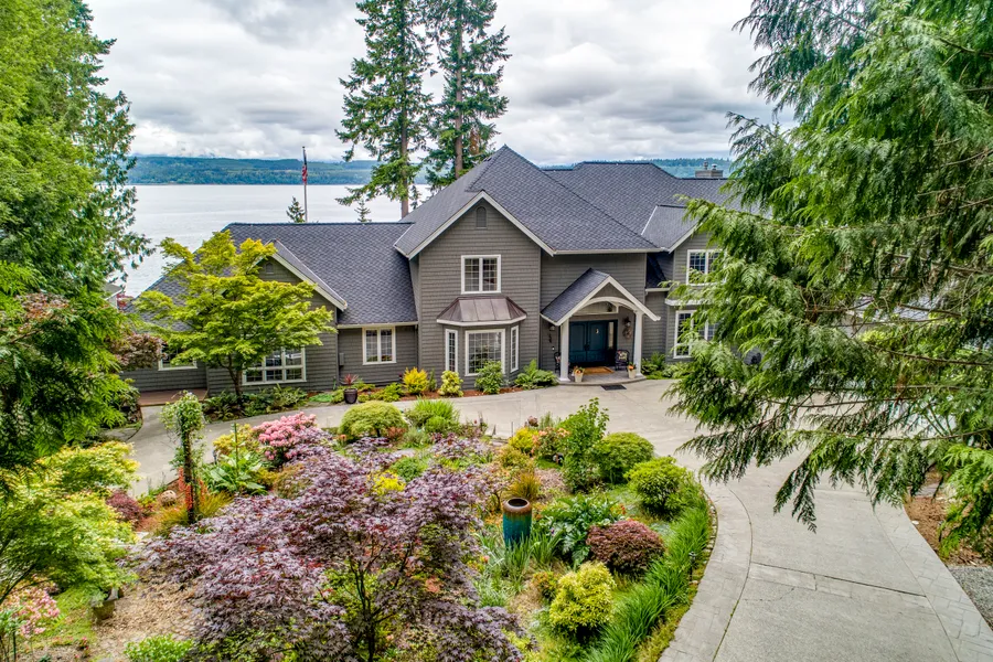 Spectacular views await you in your private waterfront estate! The snowcapped Olympic Mountains and brilliant waters of the Hood Canal are a constant panorama. 170' of pristine high bank waterfront with your own stairway to the beach. Meandering drive through evergreens and ferns bring you to your new home. The huge elegant entry is just the beginning. Two ensuite Master bedrooms, upstairs and on the main level. Chef's kitchen, enclosed view porch with fireplace and drop down TV for cozy entertaining, are just a few of the delights here. Perfect for retreats or events, MIL apartment on the main level, many opportunities await your vision! One of a kind custom property, look no further!