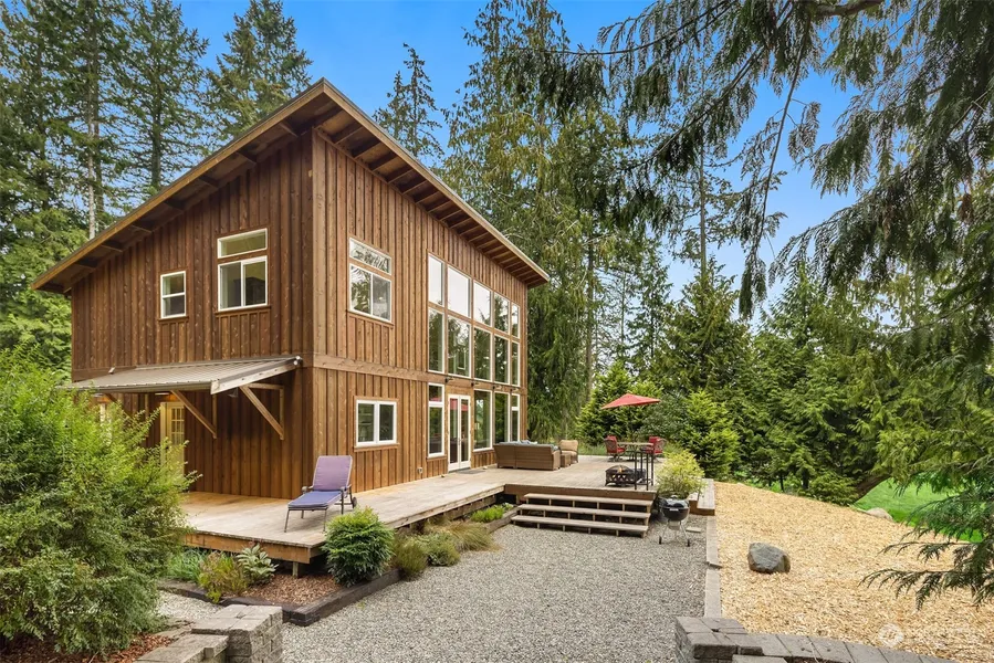 Enjoy this Custom Architecturally pleasing home. Step into your open floor plan boasting exposed beams, two story windows & beautiful Maple hardwood floors. The stunning kitchen adds to the casual functional lifestyle, chefs style with high end appliances. Sleep well in the main floor bedroom with attached bath, while the Primary Bedroom is located on the upper level. The Primary on-suite bath is elegantly designed with a gorgeous walk in shower & soaking tub. An entertaining deck too! Perfectly sited on five acres full of sunshine and privacy. The AMAZING detached garage is 40' X 60' of insulated space with in-floor radiant heat! Perfect for extra RV parking, storage & workshop! Gardners delight with a greenhouse including water and power!