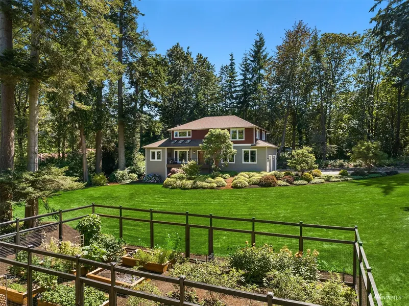 Classic Bainbridge home in historic Eagledale is private and spacious! Thoughtful and classy updates include new manufactured wood decks, fabulous landscape design by Bliss, fenced kitchen garden, storage shed, and 2nd driveway cut in behind garden for RV or boat storage. Plenty of flex space to fit your needs: spacious chef's kitchen, primary bedroom on main floor w ensuite and fireplace, 2 BR and bonus rm upstairs, and 4th BR/media room downstairs with full bath, family room, and door to patio. Expansive back deck is wonderful for entertaining. Large eagle nest onsite is a treat for bird watching! Across Eagle Harbor from the ferry dock, seasonal peekaboo water view. Close to Pritchard Park, just lovely!