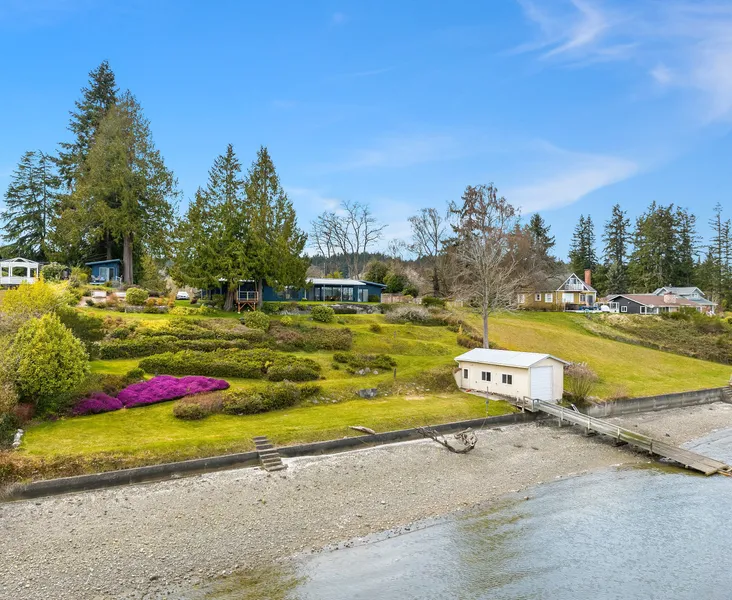 A private retreat in Scandia, this home features both the beauty of 150 ft of bulk-headed waterfront & a sunny, pastoral front acre+ where you have room to pursue your dreams! Property highlights: beachside features a boathouse w/ electric winch, davit, deep water mooring buoy & finished detached studio with views of Liberty Bay. The front acre+ includes fruit trees, expansive lawn & shop w/ carport.This one-level mid-century modern home has recent updates including an Eichler inspired entry with koi pond. An open beam ceiling, hardwood floors in the living room & remodeled kitchen (2017) with expansive views of the water highlight the smart design of this mid-century ranch. This home is a rare, waterfront haven in historic Scandia.