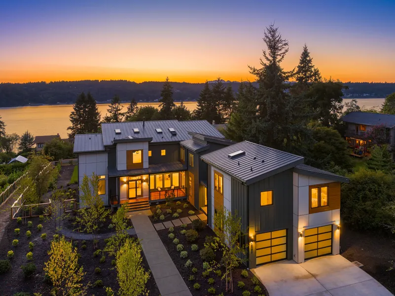 Luxury, Modern Living with beautiful, professional landscaping and water views from most every room. The main floor boasts open concept living with 10 foot ceilings, tall view windows and indoor/outdoor living. The high-end gourmet kitchen has Viking appliances including the 8-burner dual fuel range with double oven and remote blower hood; breakfast counter and custom rift oak cabinets. The double-sided fireplace serves the living room and deck. The family room and the study have French doors to decks. The second floor boasts vaulted ceilings with skylights. An art space, flooded with natural light, and French doors open to the primary suite graced with a folding glass wall (NanaWall) to the private water view balcony; an extra large walk-in closet with built-ins and two windows; a fireplace and luxurious bath with soaking tub, tile/glass walk-in shower, double sink vanity, linen closet,...