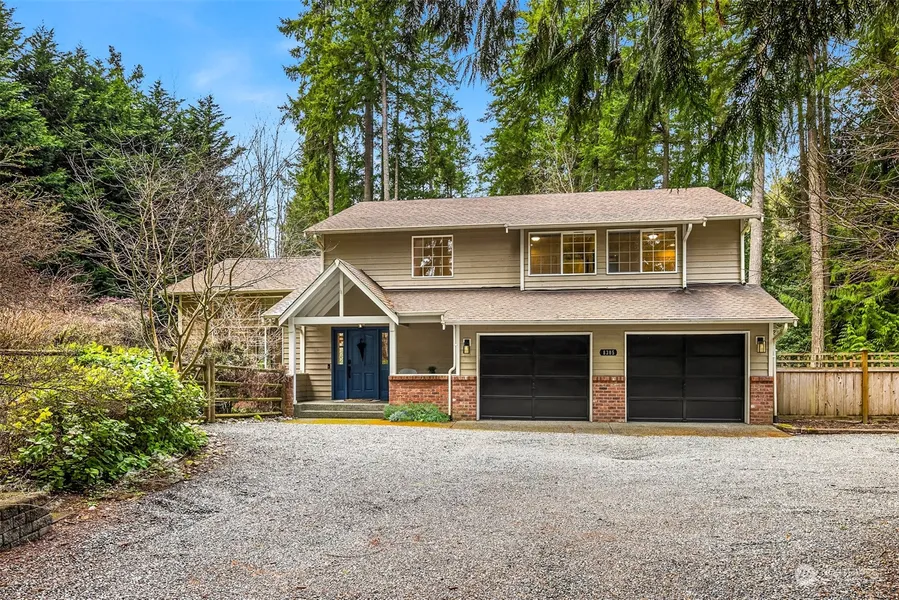 Surrounded by lush fenced gardens, this private home is classic Bainbridge. Vaulted ceilings, abundant windows, and skylights flood this home with light. Downstairs, daily life flows easily with an eat-in kitchen connected to a bonus room with cozy, wood-burning fireplace. The separate entertaining and dining area is perfect for elegant gatherings. A secluded office provides a quiet spot for those working from home. The upstairs bedrooms have pretty views of the surrounding gardens and dedicated open space that backs up to the property. The primary, with en-suite bath, has a spacious custom closet. Three additional bedrooms share their own full bathroom. Public trails and beach access are less than a mile away in this charming neighborhood.