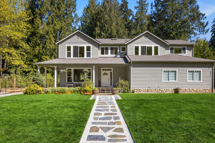 Situated on the end of a tree lined private drive is a serene & sun drenched 5 acre estate, offering unparalleled privacy and natural beauty throughout. The 2,989 sf residence has been professionally updated with new floors, interior and exterior paint, new roof, windows, insulation, patio, new range, double oven and kitchen counter. Plenty of room within the attached 3 car garage and ample space for boat & storage. Located off a non-through country road, traffic is a minimum and minutes to Winslow, beaches, parks and many trails. The sunshine on this property produces incredible gardens that include wine grapes, fruit trees, berries, flowers, vegetables & much more. The inviting wrap around deck and new patio brings inside living outdoors!