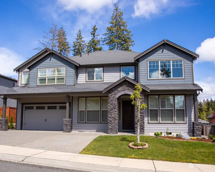Experience luxury living at McCormick Woods, surrounded by amenities such as a golf course, nature trails, playgrounds, and sports courts. Built by Garrette Custom Homes in 2018, this residence boasts custom touches and tall ceilings. The chef's kitchen features granite countertops and a side-by-side column fridge/freezer. Entertain effortlessly on the covered deck with an outdoor fireplace and enjoy serene views of the fully fenced backyard overlooking a greenbelt. Retreat to the primary suite with its luxurious bathroom. Custom shutter blinds adorn every window, adding sophistication. With a spacious three-car garage and a spice kitchen, this home offers ultimate comfort. Located minutes from Hwy 16 and 20 minutes Southworth-SEA ferry.