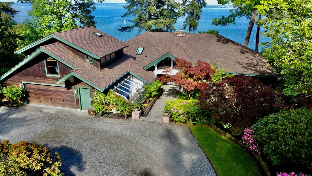 Beautiful, one level, custom-built waterfront home with stunning views of Seattle, the Cascades, Mt Rainier and Mt Baker. First time ever on the market! Designed and built with love and care to bring loved ones together; to inspire lasting memories. The living room has soaring ceilings, tall windows and sliding glass doors to the deck/spa, perfect for indoor/outdoor living and entertaining. The kitchen, with granite counters and solid oak cabinets, inspires warm gatherings with its cozy breakfast nook. The primary suite has a glass slider to the deck. The private guest suite offers a full bath. The private 1.6 acre property is graced with vibrant, colorful, mature gardens, a greenhouse, circular drive, a fountain and two-car garage with a shop. Stained glass windows contribute to the elegance of this lovely home.