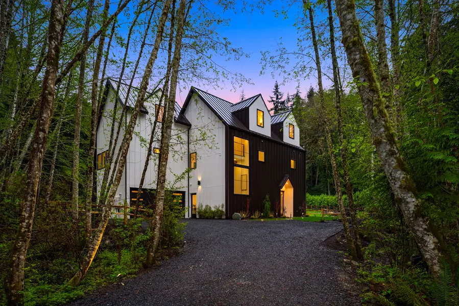 Prepare to be captivated by this striking urban design on coveted Spargur Loop in Port Madison. Sited on 1.03 acres, the dramatic column of windows, richly toned exterior colors and modern, clean design are hallmarks of this special home. The main level flows seamlessly between the living and dining spaces and chef's kitchen, featuring walnut cabinetry, calcatta premata quartz counters, artfully designed lighting and three sets of sliding doors for indoor/outdoor living and entertainment. The 1200 square foot second floor is dedicated to the primary ensuite with heated bath floors, walk-in closet, a generous second bedroom and bath, laundry and sitting room.The third floor is a spectacular light-filled retreat with vaulted ceilings, angled dormers and a 3/4 bath. At 1200 square feet, this stunning room has many possibilities. Imagine a guest retreat, studio or game room for entertaining ...