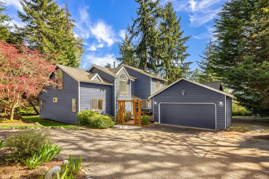 Stunning Bainbridge Island retreat where tranquility meets convenience. Nestled just minutes from the ferry and downtown Winslow, this beautifully maintained home offers a seamless blend of privacy, comfort, and style. Enjoy light-filled living spaces, vaulted ceilings, and picturesque views from nearly every room. The open-concept kitchen connects effortlessly to the dining room and also to a cozy living area with a fireplace - perfect for entertaining or quiet nights in. Two main floor bedrooms share a full bath while upstairs there is a primary suite with a loft. The office space has ample storage closets and built-in shelving. Step outside to enjoy the wrap-around deck plus gardens with mature plantings, fruit trees, and winding paths.