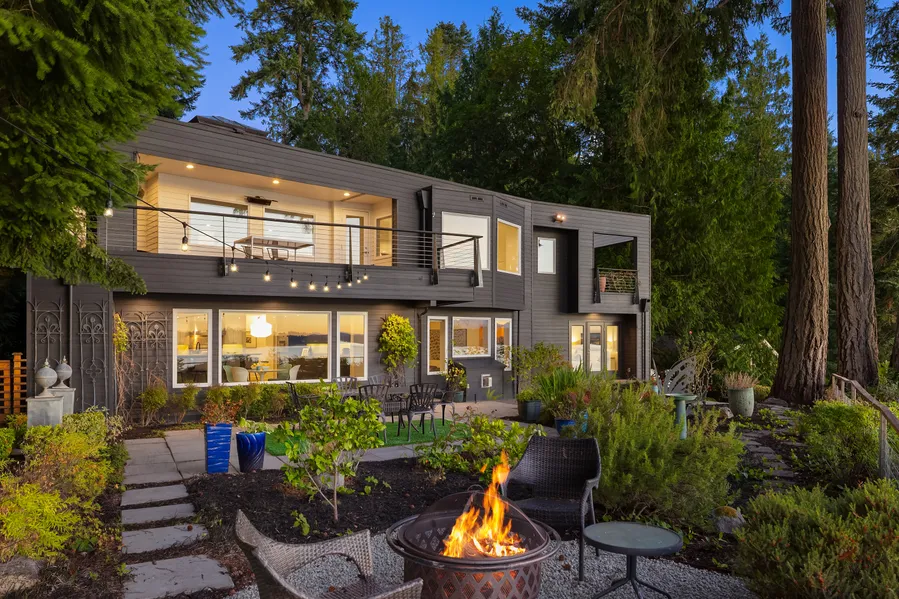 Arrow Point Modern ~ Featured in The Seattle Times, this John Brenneis-designed, Andy Mueller-built masterpiece pairs modern architecture with a stunning waterfront setting. Masterfully designed for both style and function, the airy open floor plan centers around a dramatic two-story kitchen crowned by a pyramidal skylight and features a flexible bedroom setup. Extensive windows frame sunny Northwestern exposure with commanding water views of the Olympics throughout the home. Multiple decks, a backyard oasis, and 90' of bulkheaded mid-high bank waterfront with beach stairs and a mooring buoy define coastal living here. Quiet street, tree-lined drive and partial ownership of the 4.72 acre forest across the road. Minutes to Battle Point Park and The Grand Forest.