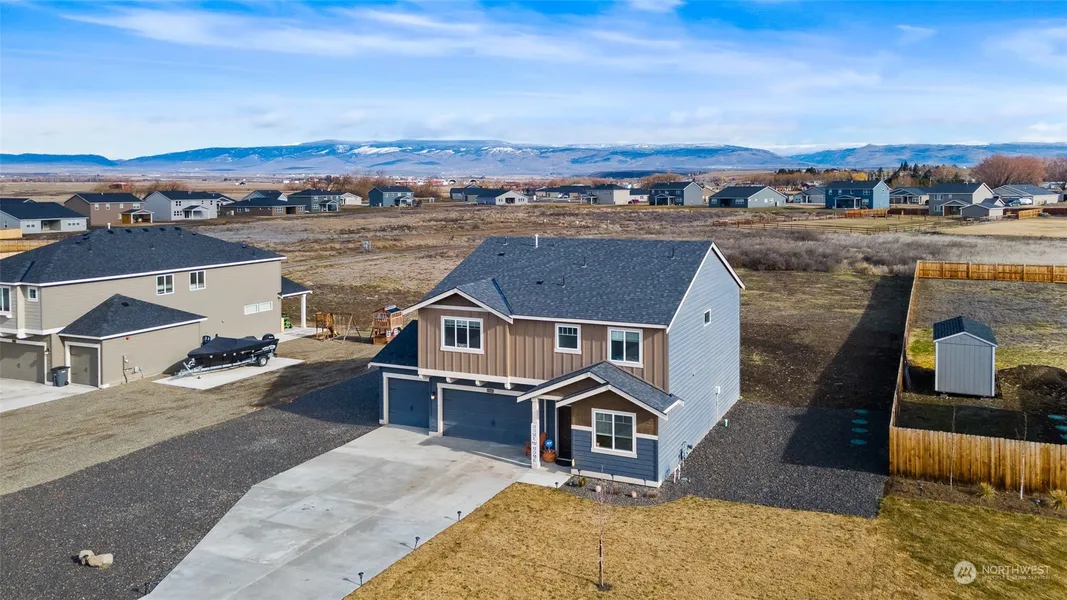 Enjoy unobstructed views of the Cascades from this meticulously maintained home on a generous ½ acre lot to make your own. Dramatic 2 story entry welcomes you to this bright & airy home. Open concept 1st floor showcases a well-appointed kitchen with quartz counters, ample cabinet storage, pantry & spacious island. Modern, electric fireplace in living room. Cozy office & ½ bath round out the 1st floor. Light filled staircase brings you to 4 bed/2 full baths. Primary bedroom offers mountain views and ensuite with a large shower, double vanity & walk-in closet. Sought-after 2nd floor laundry room with separate linen closet convenient to bedrooms. Oversized, finished 3-car garage. Beautiful, covered back patio. Come live the quiet life!