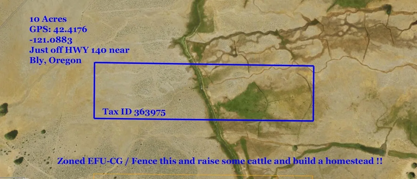 This is a rare and unique opportunity to purchase 10 acres in Bly, Oregon This lovely flat to gentle slope parcel boasts EFU-CG Zoning!Permitted Uses: In the EFU-CG zone, permitted uses typically include single-family dwellings, manufactured homes, essential services, and uses related to farming and ranching, subject to site plan review and other applicable standards.This is the perfect location for that you have been thinking about. Wanting to raise some cattle? Fence this off, bring out the cattle, and start your homestead. Situated perfectly and has the USFWS National Wetlands designation. Plenty of water here for those that graze!!Located just 2-3 minutes west of Bly, Oregon Power and phone close by.Seller is firm and will not carry a note.USE GPS AND Topos to get a good feel for this. See MLS Photos for GPS.