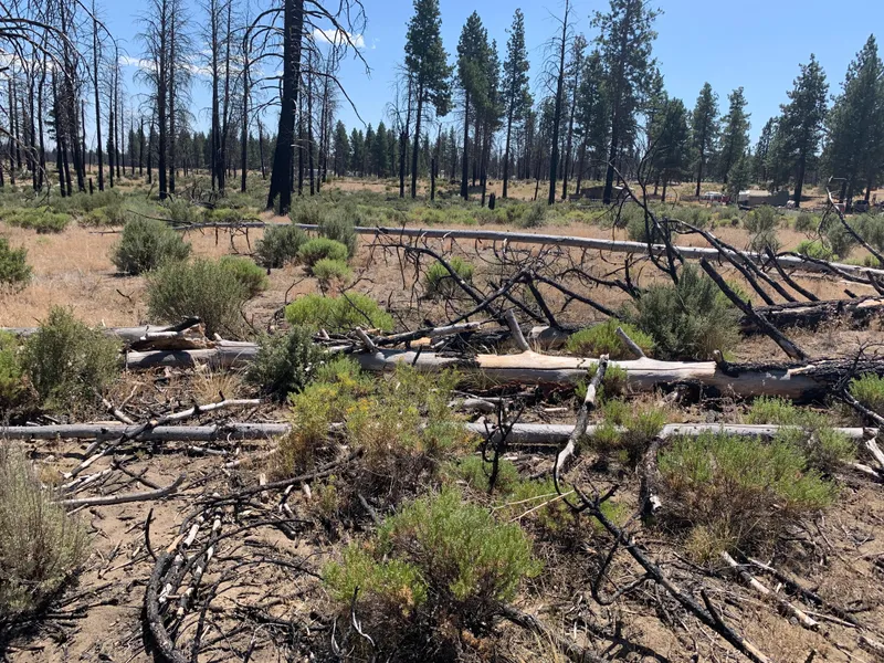 Terrain is relatively flat. Soil is mixed loam and sand. Vegetation is sage brush, grass, burnt and healthy pine trees.