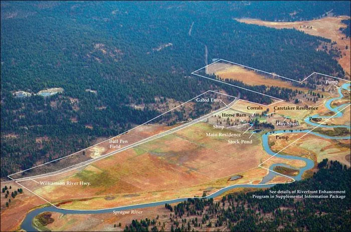 The 458 acre Rockn LB Ranch is located in the Upper Klamath Basin, 14 miles east of Upper Klamath Lake, along a meandering main stem of the Sprague River, within a wideopen valley of primarily private ranches surrounded by Winema National Forest. The Sprague River is a tributary to the Williamson River and known as a meadow stream with brook, rainbow and brown trout, and bass. Near a spring on the Sprague River in the southeast corner of the Ranch is an outstanding fishing hole. The Ranch is at an elevation of 4,200 to 4,300 feet and has frontage along Williamson River Road, with paved yearround access to Chiloquin and Highway 97 north to Bend and south to Klamath Falls.