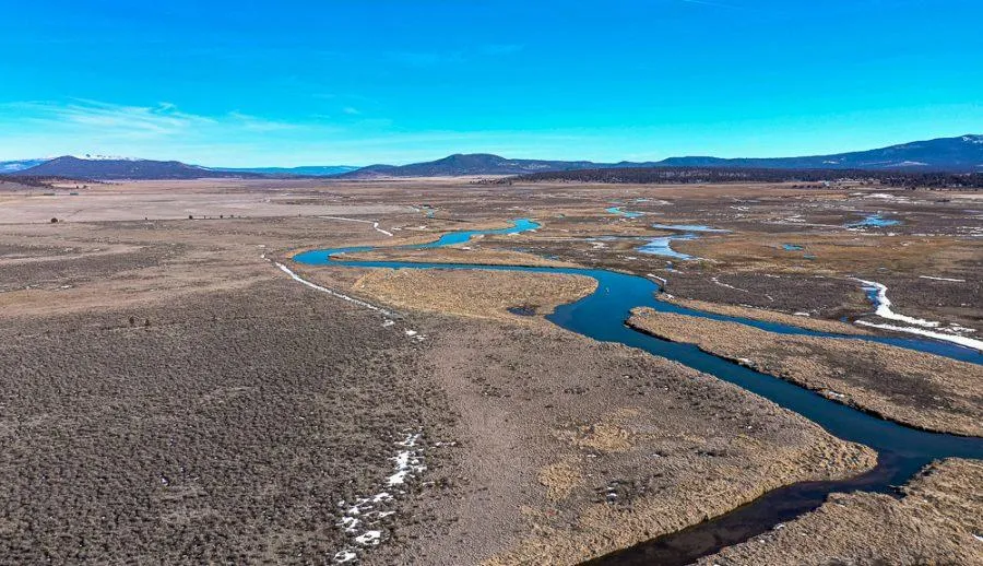 The Sprague River is about a third of a mile to the south.. If you look at some of the photos, the drone is hovering right over the River looking towards the property. Use the P-shaped road as an indication near the southwest corner of the property. This property is slightly sloped.