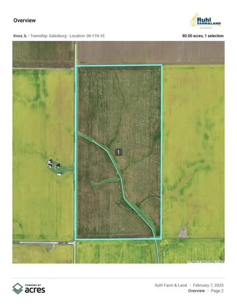 High quality farm with productive soils and good drainage on the Knox County and Warren County line just 1 mile north of the Galesburg Airport on W. Knox Rd. This farm sits on a hard road to the corner of the property and boasts a 140.2 PI rating with predominant soils being Osco Silt Loam and Ipava Silt Loam. 76.4 tillable acres with 3.6 acres of well maintained water way. This ground has been meticulously cared for over the years with solid conservation practices. 2024 beans yielded 57 bushel per acre, but most years produce yields in the mid 60's. 2023 corn yielded 250 bushel per acre. Soil tests from 2023 are available. Tenant rights through the 2025 crop year. Ground can be open for the 2026 crop year. Current tenant is related to seller and would entertain continuing to lease the ground.