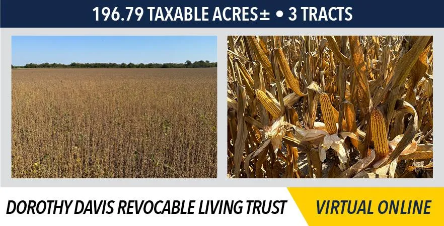 The Davis farm will be sold on a price per acre basis, based on taxable acres. All tracts will be offered through the marketing method of Buyers Choice, whereas the high bidder can elect any of the tracts for their high bid. If the high bidder does not elect all offered tracts, then the remaining tract(s) will continue to be offered Buyers Choice until all tracts have been elected. The tracts will NOT be offered in their entirety at the conclusion of the auction.