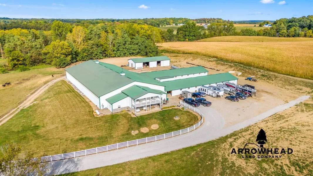 Welcome to Knox County and to this turn-key commercial horse arena, boarding, and training facility which is situated on +/- 7 spacious acres. Located about 50 +/- minutes from Columbus, Ohio, about 50 +/- minutes to Zanesville, and just about 15 +/- minutes to Mount Vernon sits this one of a kind business opportunity. Surrounded by wonderful views and just far enough from big city life, you will find multiple buildings that are set up and ready to board, train, and give a horse its best life possible. The main arena is a massive 80’ x 160’ foot facility, 12,800 sq feet, with a metal roof and 4 ft centers. There is plenty of lighting, including some LED lightning. Attached to the arena is an awesome, second level viewing/lounge area with large open glass windows to view the horses and riders in action. You and your guests/clients will really appreciate what the lounge offers as it can be the setting for relaxation, beverages, and even get togethers for other functions. There is recessed lighting, a bathroom, and even an office below! Now to the boarding facilities which offer 32 awesome, ready to go stalls, all with sliding doors. Just outside the main entrance to Arena you will find two identical 30’ x 100’ Stall Barns, each having 16 stalls and metal roofing! Each barn contains a gorgeous tack room, wash bay and a utility room. There is concrete flooring down the centers of each barn (less mud) and large sliding doors at the ends of each barn. There is an additional 24’ x 60’ hay/equipment barn with some concrete flooring and a metal roof. The horses and clients will really enjoy the outdoor arena which is approximately 120’ x 150’. The ground in the outdoor arena is a special mixture which came from the Quarter Horse Congress! There is a bulk shavings shed that will ensure your stalls have the freshest bulk shavings. The source for the shavings is only ten miles away. There is plenty of parking for fifth wheel rigs to allow for unloading of horses and cattle, etc. To the west, there is some fencing to accommodate roping steers and other livestock. Centrally located to the facility is a training yard which is the perfect location for a walker/trainer. The facility also has a one bedroom/one full bath furnished apartment. This apartment could be utilized by a resident/manager, maybe AIRBNB or a live-in investor/owner. There is a spacious front porch and beautiful covered second level area with a view that will satisfy for sure. On the other side of the large parking area is a very convenient location where a home could be built, additional barns constructed or maybe an additional outdoor arena. The possibilities are endless with this facility and ongoing business. There are currently +/- 16 horses boarded here. The facility is running at half capacity and the need for boarding is on the rise as more people enter the horse world. There are resident trainers and other trainers who lease training time here to accommodate clients' needs. The current owner is a well known trainer, border, and horse enthusiast and can stay on as a temporary consultant. There is 400 amp electric service, septic, and private water. There is propane with central heating/AC. This facility really is an opportunity of a lifetime. With the proximity to Columbus, Ohio, the potential of this facility is endless. Equipment on site, mobile fencing, tractors etc, do not convey, but may be negotiable. Apartment square footage is estimated. Walker is not being conveyed. Showings will require a strict 48 hour notice and agents must be present for all showings, appraisals, inspections, etc.. Sellers Oil, Gas and mineral rights convey. All showings are by appointment only. If you have any questions or are interested in a private showing, please contact Brian Whitt at (937) 545-7764 or Josh Grant at (330) 341-0997 .