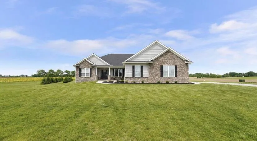 CUSTOM ONE STORY HOME ON 5.7+ ACRES! 4 BDRMS, 4.5 BATHS. Den w/ custom barn doors & built ins. Vaulted great room w/ custom built ins, mantle & electric fireplace. ENORMOUS kitchen w/ 10' island, quartz counters, ss appliances, gas range, farmhouse sink & soft close Amish cabinetry. Oversized dining w/ vaulted ceiling. From covered concrete patio, enjoy sunset views over the newly constructed pond, awaiting your final touches. Owners suite w/ luxury bath & large WIC, 2 addtl bdrms w/ full baths & large closets, built in cubbies, 1/2 bath and laundry complete the main lvl. FULL FINISHED BASEMENT w/ rec room, bdrm, full bath & storage/utility space. RO drinking water system/whole house softener, Generac Guardian whole house generator, oversized 3 car garage.