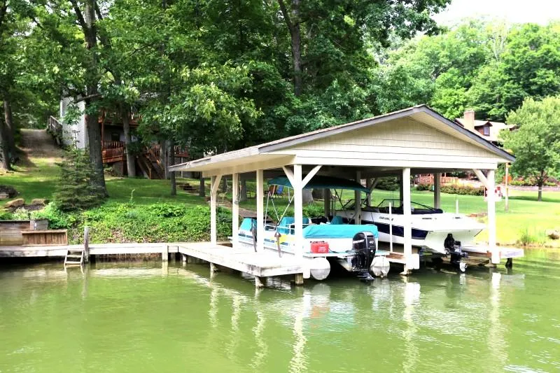 Located on Greenacre Dr - Beautiful cove location. Open floor plan- Great room with vaulted ceilings to loft. Huge updated kitchen with lots of cabinets and countertops opens to lakeside dining area with floor to near ceiling windows looking out to the deck and lake. 1st floor den or possible 4th bedroom. Loft area would be great for overflow sleeping - has a half bath for convenience. Lower walkout level has 2 guest bedrooms, full bath and lakeside owners suite with walk in closet and full bath. Large decks to the lake side at main level and lower level. 2 car garage will accommodate adult and kid toys! Great yard for playing and relaxing leads to the updated 2 slip covered boat dock. Additional gravel drive to the lower yard is great for access of loading and unloading. The average AV lakefront Sold in 2014 has been over 500k! This is an amazing opportunity!