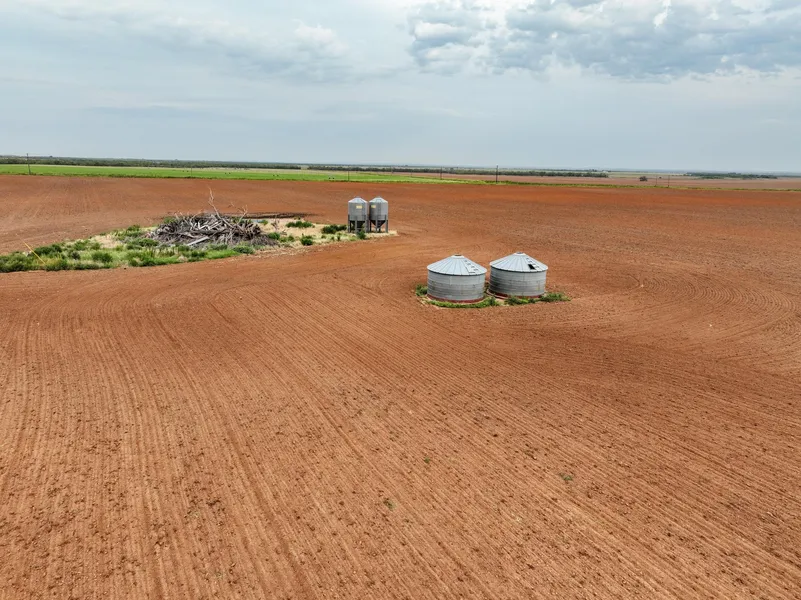 The farm has two cone bottom grain silos, two additional grain bins and one stock water well.