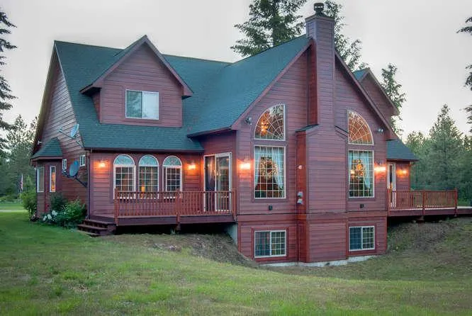 CountryMusic. 10 Acre North Idaho Country Estate 5161 sq ft Country Home, nestled in wooded privacy, close city. The open floor-plan demonstrates a commitment to informal togetherness & comfortable familiarity featuring 26 ft Dining area off the Great Room Cook & Company alike will enjoy the view through a Trio of Palladian Windows above the Sink. Natural light filters through the French Doors Opening to the Wrap-Around Deck. A Massive Granite Island with Prep Sink & Full-Length Breakfast Bar will surely become a favored gathering place. Knotty Alder Cabinetry with Pan Drawers & Pull-Outs, & Kitchen Aid Appliances: Wine Cooler, Built in Refrigerator, Double Wall Ovens, 6 Burner Gas Cook Top with Hood. Island, Cabinetry, & Appliances are settled atop an expanse of beautiful Hardwood.