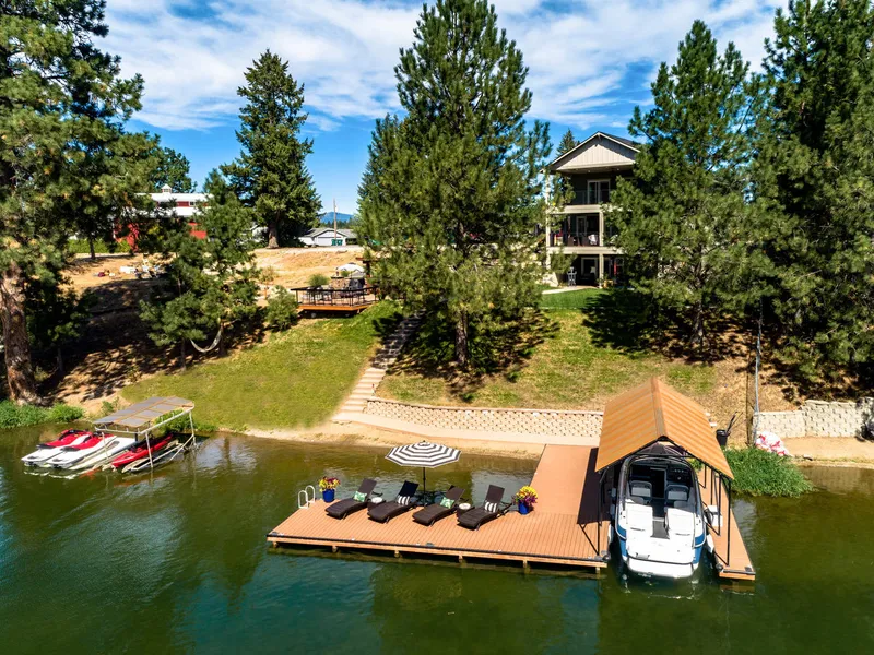 Welcome to the beautiful ''Tranquilo Bay'' on the Spokane River. View our video tour. This extraordinary home is nestled in its own wake free bay with stunning river and mountain views from every level. Complete with two master suites, a guest suite, a chef's dream open kitchen with all stainless steel appliances. Each floor opening up onto its own spacious river view outdoor living area & workout patio. Its manicured outdoor landscaping surrounds an outdoor waterfront pergola bar & entertaining patio which is the highlight of the property. Spilling down grand concrete steps to your private covered boat slip, jet ski dock, and on water sunbathing deck & patio. Experience this amazing home and its tranquil relaxing location, ''RIVER LIFE'' at its finest.